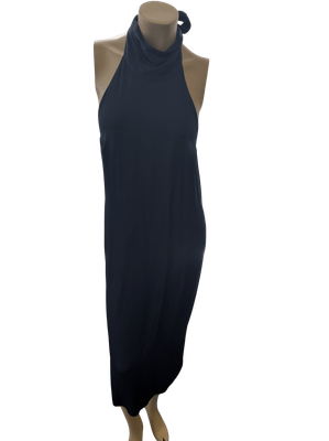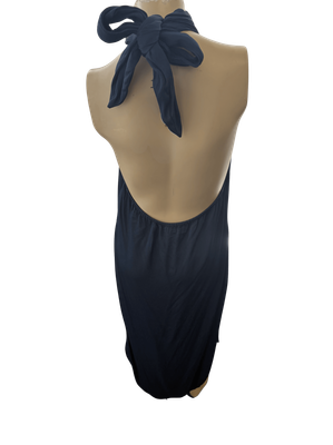 Pre-Loved Chic Navy Halter Neck Open Back Midi Dress with Self-Tie Bow - Effortless Elegant Style!